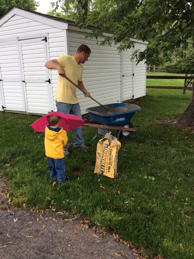 We mixed and hauled and scraped and mixed. It wasn’t really suppose to rain according to Accuweather, but of course it did as soon as we began pouring and mixing concrete.
