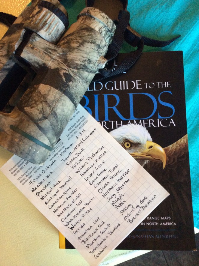 Tonight we grabbed our bonocs and bird book and a little snack and headed out to do some bird watching. Freeze Out Lake is just a few miles from our house. And yes, it’s named Freeze Out since it quite often freezes solid in the winter. Shallow acres of water that lie in wide open spaces of ranch land. Cat tails and marshy areas make it a perfect bird habitat. We’ve been crazy busy the last while with spring clean ups and spring activities and dawn to dark schedules. Bird watching is a super relaxing way to spend a perfect Sunday evening.
