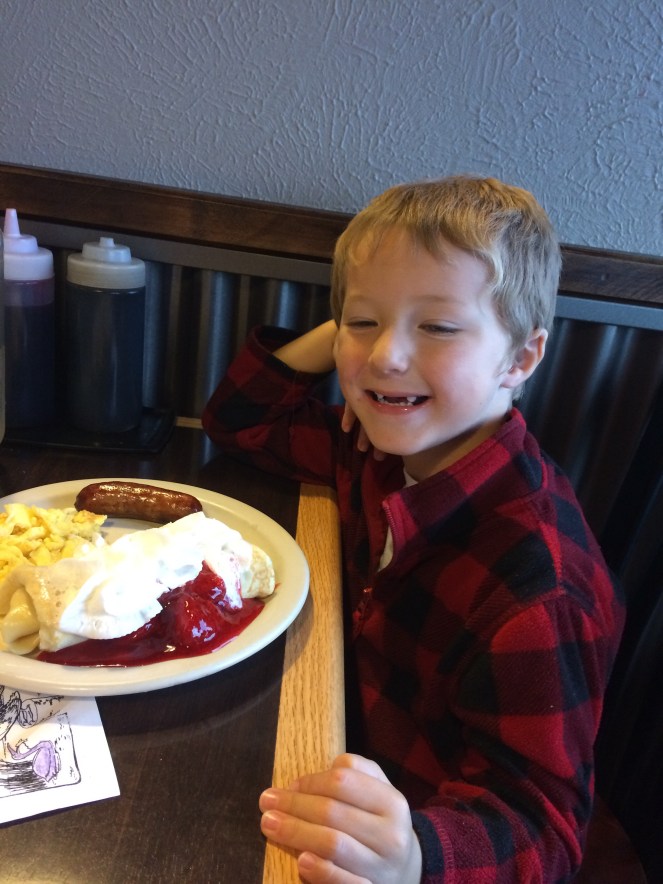 And then I wonder if my tolerance has made him soft. For instance, while his taste buds are quite amazing and his critiques of my cooking make me laugh, there’s also a point where you eat what’s on your plate and don’t make a fuss because there is less sugar then one remembers. Take for instance, this amazing rolled pancake at Paul’s Pancake Parlor in Missoula.