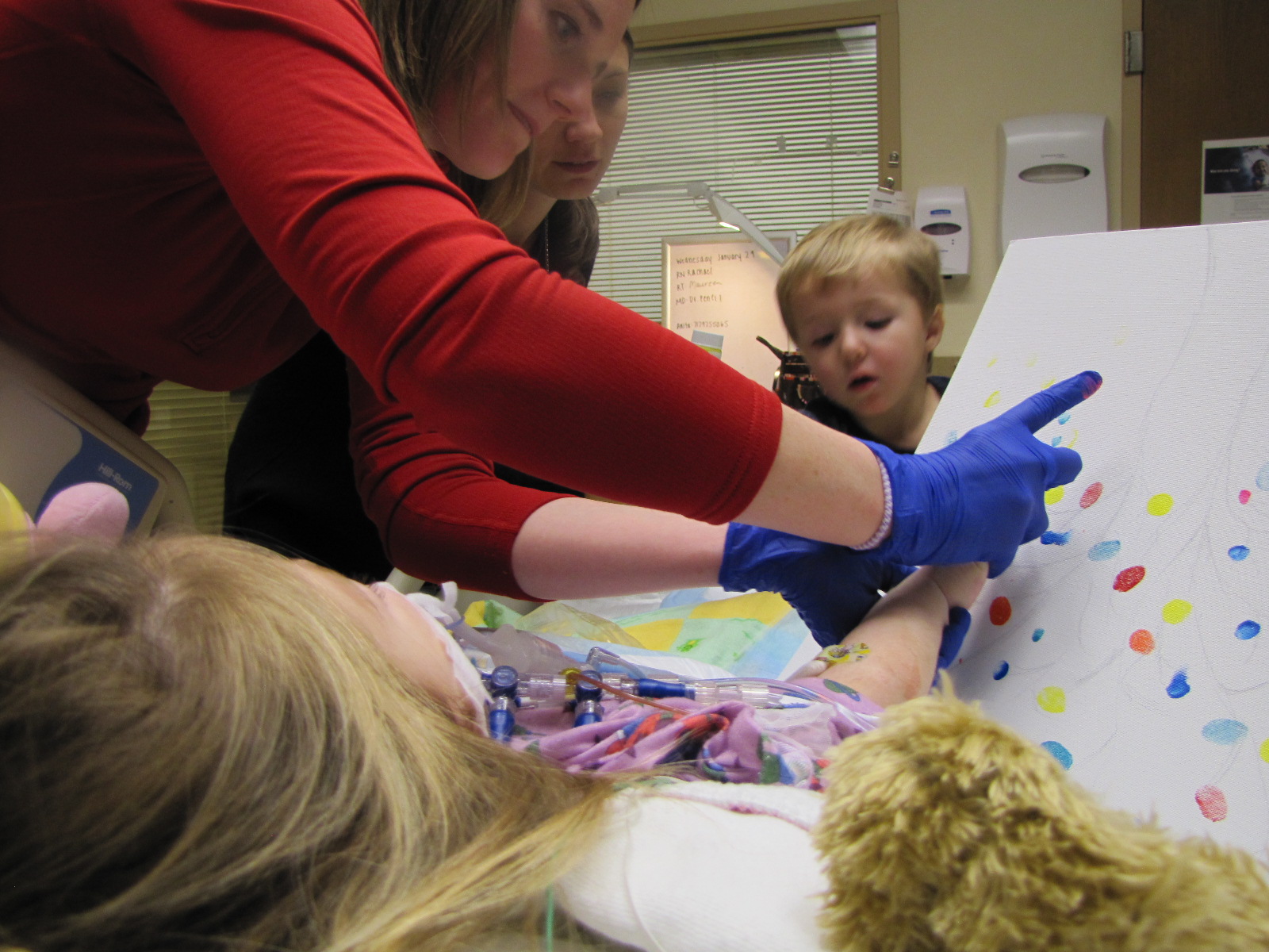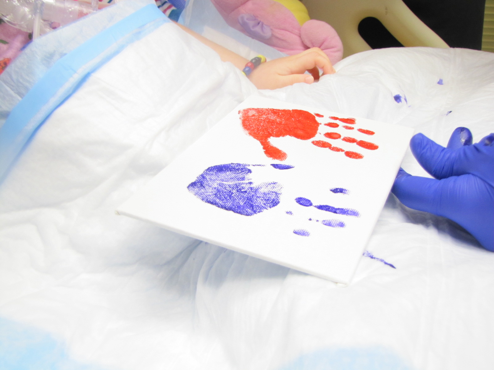 Linda and her girls brought Kobe down in the afternoon. The Child Life Specialists came by and did some fun painting projects with the children and took a mold of Kierra’s hand prints.