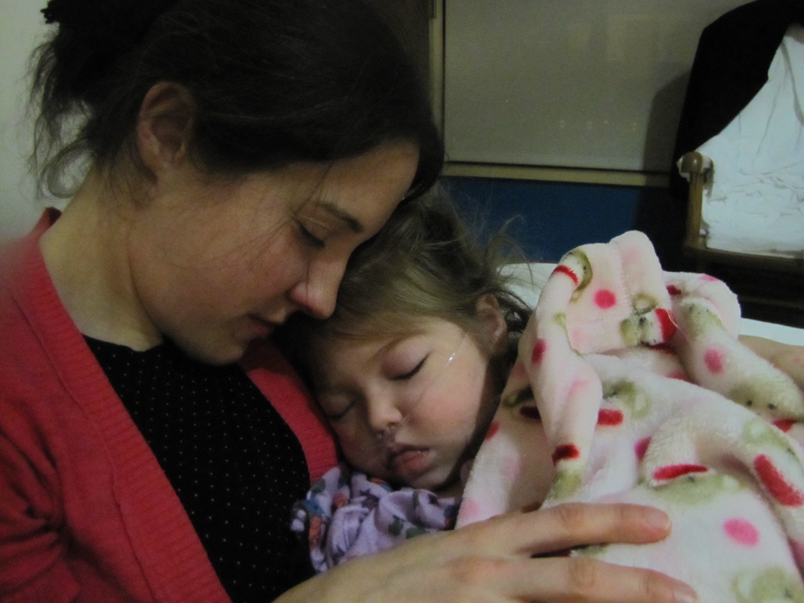At first, she did OK with her oxygen. And snuggled into our arms.